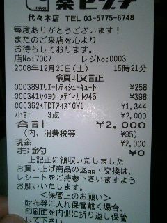 2,200円くらいだと思ったんだけどなぁ。2,000円ピッタリだったので驚いた。なかなか、こう、ジャストにならないので、なんか嬉しい。