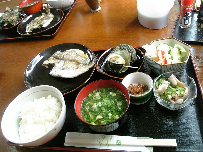 朝市定食朝ご飯は、ちょっと豪勢に。エボダイの干物を焼いたの。サザエ。アサリを煮たの。イカマリネ。この、お店には「イセエビの煮込みうどん」というメニューもあった。しかし、恐れ多くて、私は食べれないな。