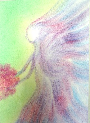 守護天使久しぶりで、私も随分と変化したと思うので、守護天使の絵を描いてもらった。前に描いて貰った時と、だいぶ感じが違う。お花を持っている。天使が変わったらしい。けど、背景が緑(癒しの色)なのは一緒だった。