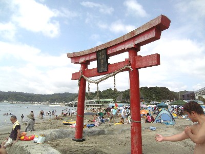 勝浦中央海水浴場勝浦中央海水浴場は、いきなり、鳥居がお出迎えしてくれた。熊野貴船神社って書いてある。しかし、神社自体は、だいぶ離れたところにあって、海岸にはないし見えもしない。何故ここに鳥居が建っているのか不思議だ。