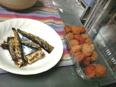 晩御飯その1晩御飯は、朝市で買ってきた、あおさの味噌汁。いわしの甘露煮。梅干。