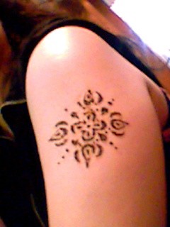 ヘナアート二の腕に、ヘナで絵を描いてもらった。これ、浄化になるんだって!