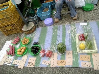 きゅうり、とまと、100円塩もみしたキュウリを、割り箸に差したのが売られていた。ウチで育てている曲がりキュウリじゃ、これ、出来ないな。