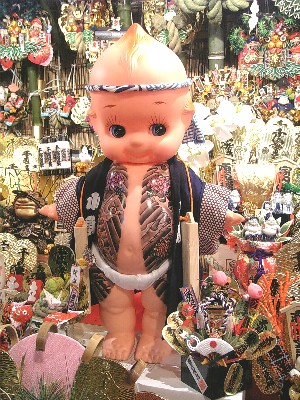 刺青キューピー最初に見た、アスカとレイの置物の後ろには、もんもんの入った巨大キューピーがいたよ。