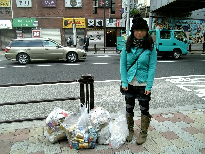 私が持っていたのは、燃えるゴミ1袋、缶1袋、ビン1袋の合計3袋。これを持って歩くだけで、かなり筋肉が鍛えられそうな重さだ。