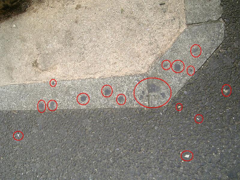 道端のガムこの写真は、代々木で撮ったものだけど、黒い斑点(赤で丸してあるもの)は、全てガムってことだよ。