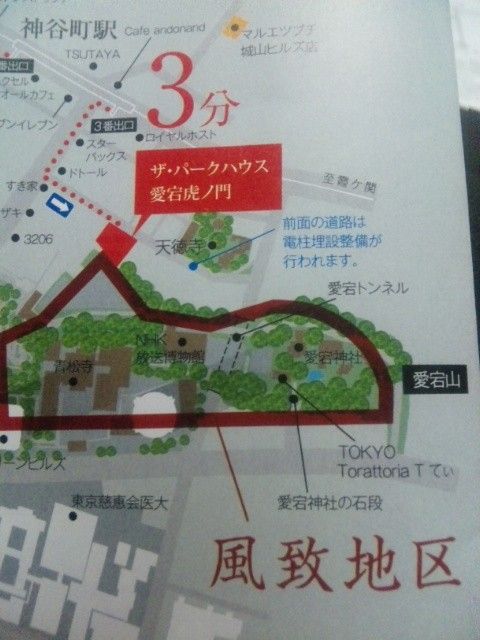 それで、新橋だっけ?どこだっけ?という話になっている時に、生徒さんの手元を見たら、家相のお勉強で使うために持ってきて貰ったお部屋の図面(マンション販売の広告チラシ)に、なんと、愛宕神社までの地図が書いてあった!